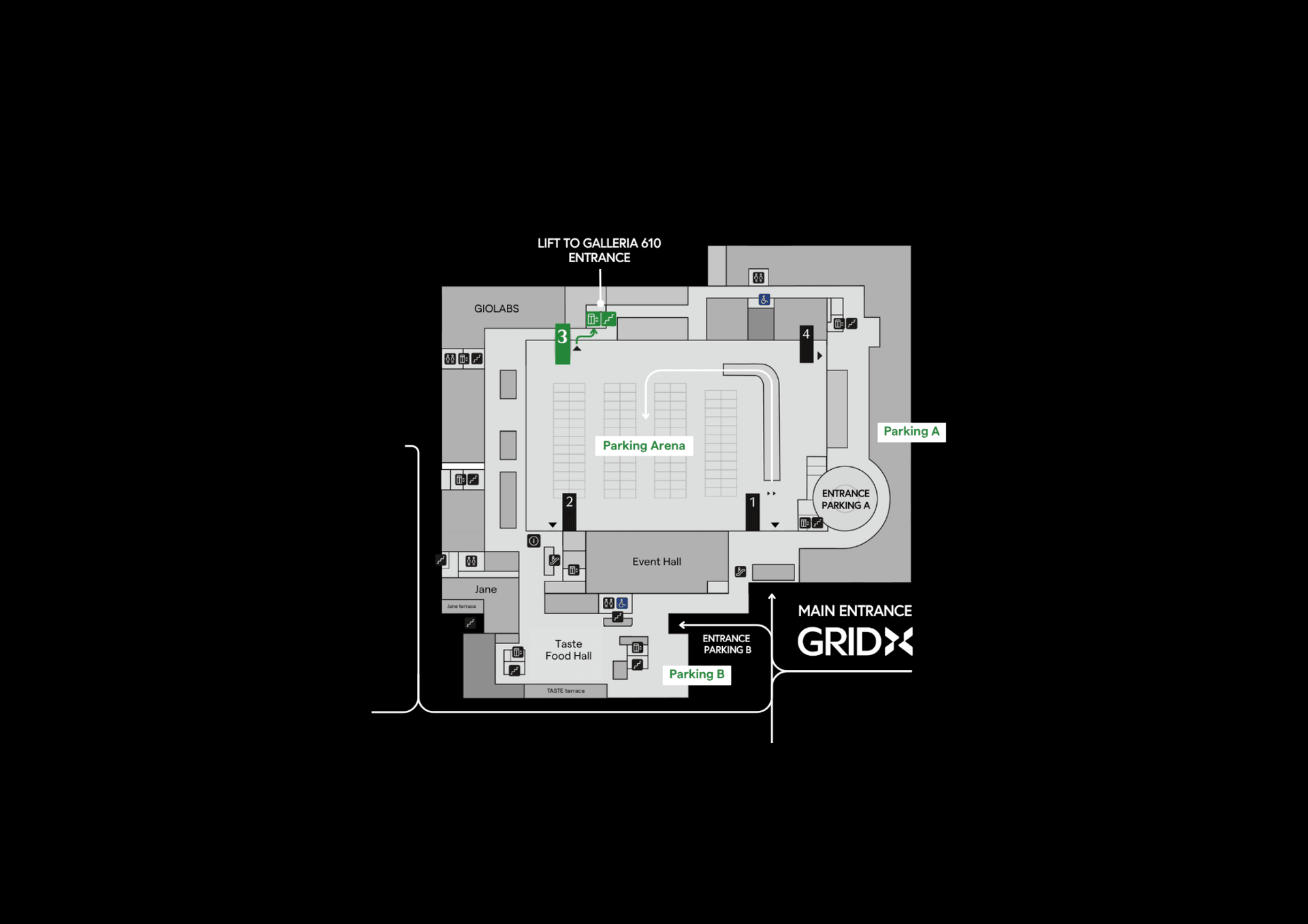 Commencez votre parcours à l'Entrée 3, dans l'Arena. Prenez l'ascenseur jusqu'au niveau 0 et laissez l'expérience commencer - Galleria 610 vous attend juste devant.